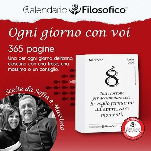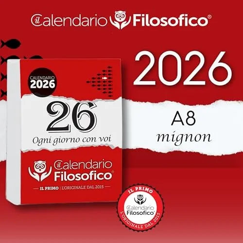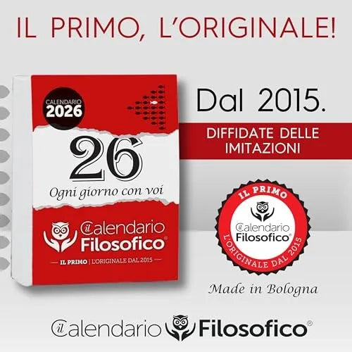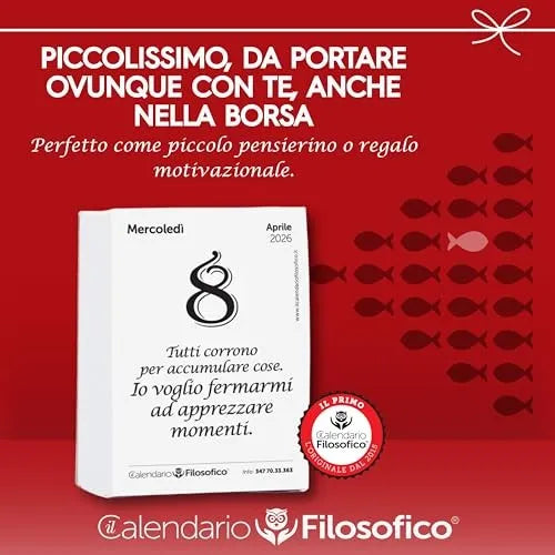 Il Calendario Filosofico è un regalo lungo un anno. Ideale per i tuoi pensierini di Natale per amici e amiche e se hai un'attività anche per i tuoi Clienti. Perfetto da tenere a casa, in un angolo della tua scrivania in ufficio oppure da portare sempre con te in borsa.