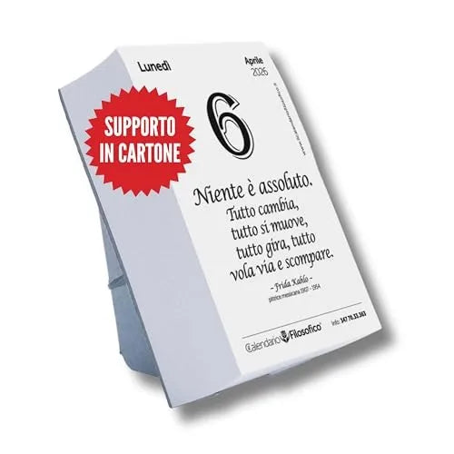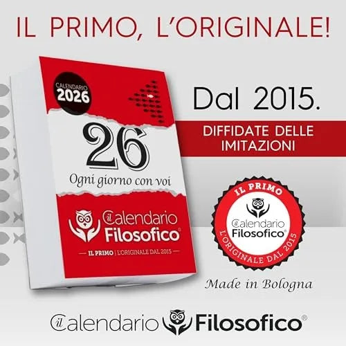 IL PRIMO, L'ORIGINALE: Prodotto artigianalmente a Bologna dal 2015, il Calendario Filosofico è stato il primo calendario da tavola con frasi filosofiche e vanta numerosi tentativi di imitazione. In ogni pagina del calendario trovi il numero di telefono di Sofia e Massimo. Per qualsiasi informazione puoi parlare direttamente con loro