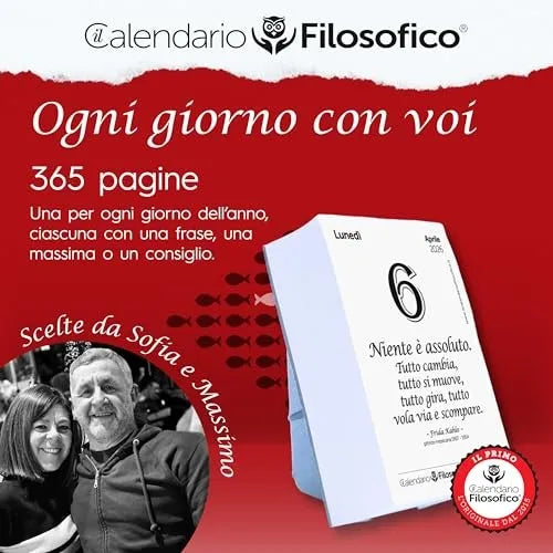 FRASI FILOSOFICHE: Il Calendario Filosofico comprende 365 pagine. Ogni giorno Sofia e Massimo scelgono per te, con passione da 10 anni, una frase per invitarti a riflettere, cambiare, osare e migliorare. Da leggere, conservare e condividere con chi vuoi