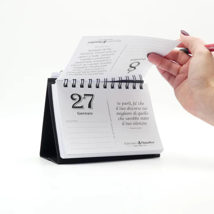 Se un regolare calendario è un regalo lungo un anno, questo è un regalo che può durare per sempre! Si può usare come un normale Calendario Filosofico, girando le pagine un giorno dopo l’altro e gustando una frase diversa al giorno; ma ci si può anche soffermare sulla propria frase preferita o tenere sotto gli occhi una data speciale. Elegante e minimale, è un regalo che piacerà a tutti, ideale da tenere in esposizione in ufficio, in negozio o in sala d’aspetto.