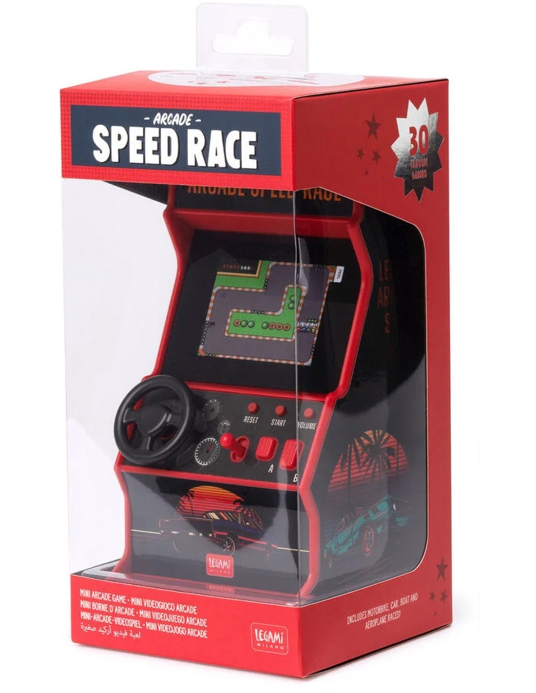 Il Mini Videogioco Arcade - Speed Race di Legami ricrea la magia delle sale giochi a casa tua. Grazie ai pratici comandi e allo schermo da 2,4”, potrai sfidare te stesso e i tuoi amici a 30 diversi giochi tra gare di moto, auto, barche e aerei. Just press play!