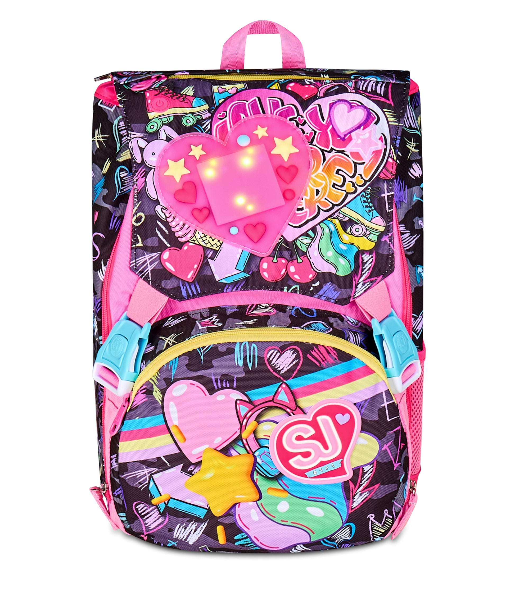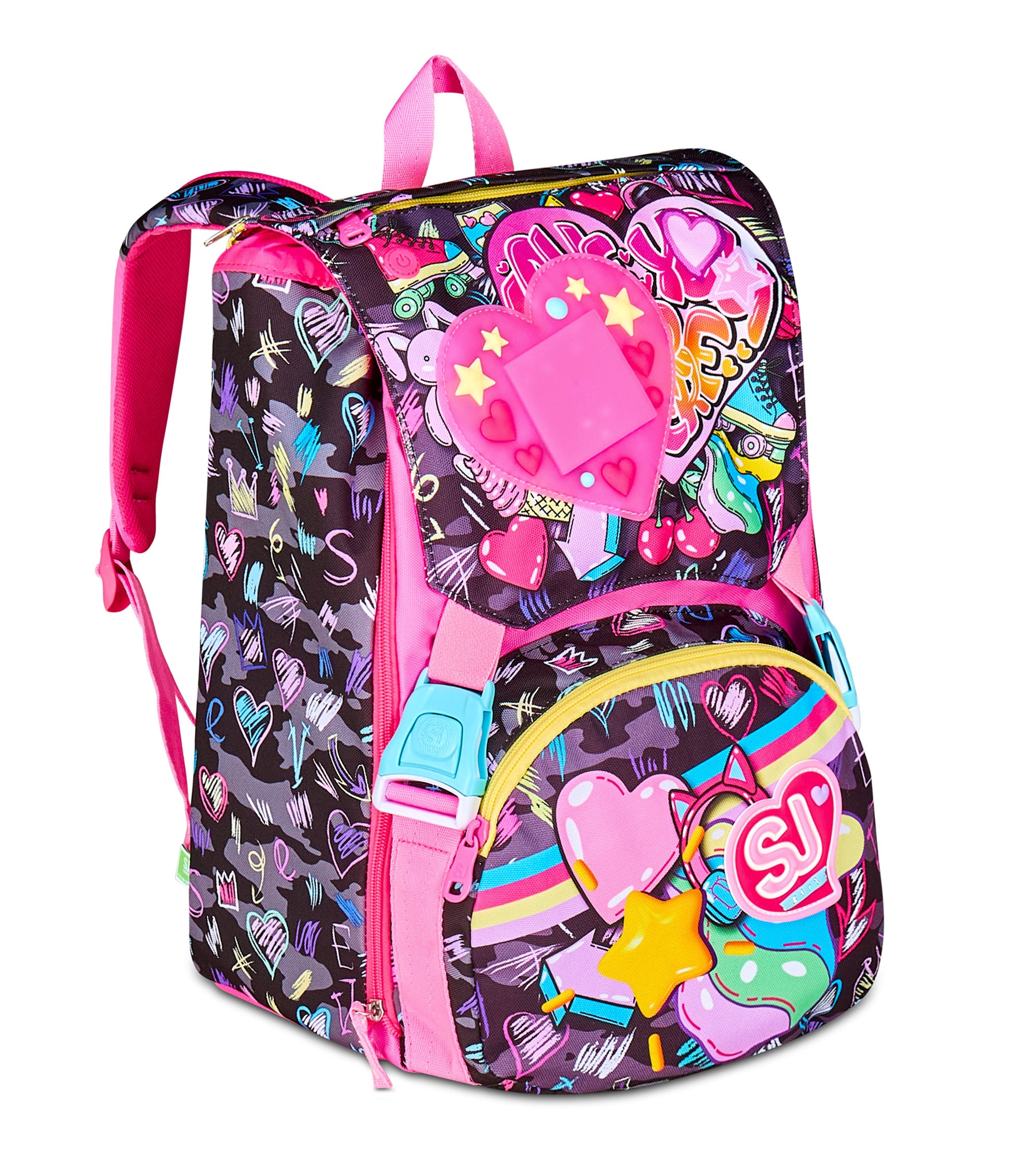 Ciao! Sono GAME-LED GIRL, lo zaino estensibile SJ GANG cui vai a scuola e con cui puoi giocare col LED LUMINOSO posizionato sulla pattina staccabile! Divertiti ad accendere il LED tramite il pulsante on/off, e ricaricalo attraverso l’usb quando vuoi . Ho un doppio scomparto spazioso, di cui puoi aumentare facilmente la capienza tramite le zip laterali per poter accogliere e distribuire in modo ottimale libri, quaderni e tutto ciò che ti serve per la tua giornata, potendo sfruttare anche la tasca frontale. Inoltre, sono davvero comodo da indossare sulle spalle, grazie a schienale e spallacci confortevoli. In più, il fondo integrato mantiene la mia struttura inalterata, garantendo la stabilità del contenuto anche a pieno carico.